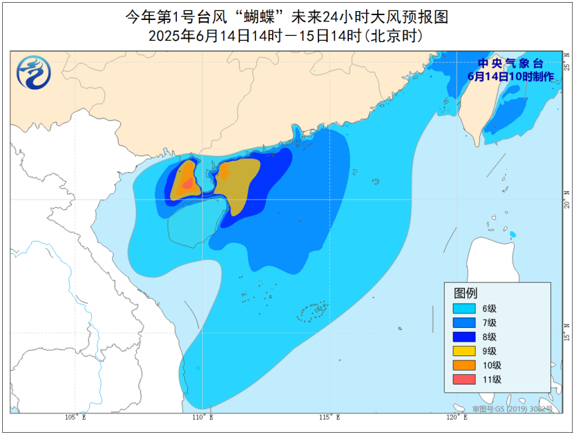 大風預報:6月14日14時至15日14時,南海西部、北部灣、瓊州海峽、西沙羣島、中沙羣島、海南島沿海、廣東中西沿海、廣西沿海、雷州半島將有6至8級風,陣風9至10級,部分地區風力有9至10級,颱風中心經過的海域或地區風力可達11至12級,陣風13至14級。