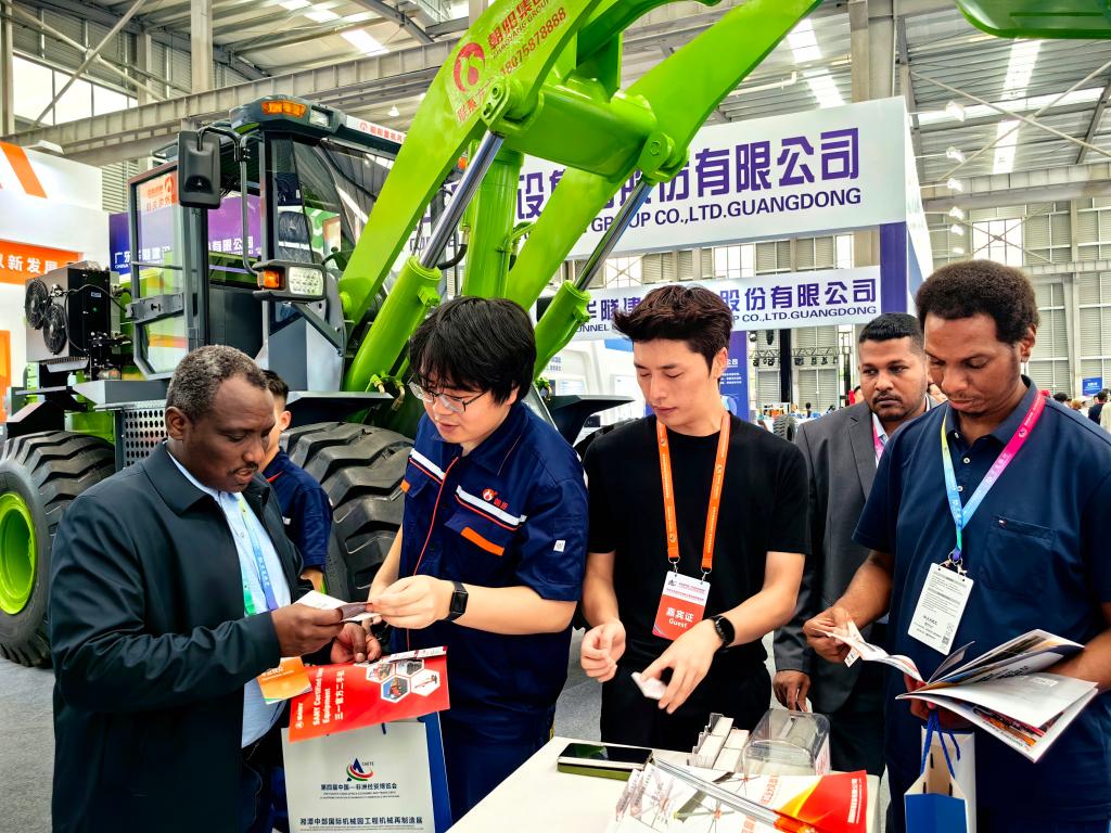 非洲國家客商在衡陽市朝陽重機有限公司再製造電動裝載機展位諮詢。新華社記者蘇曉洲 攝