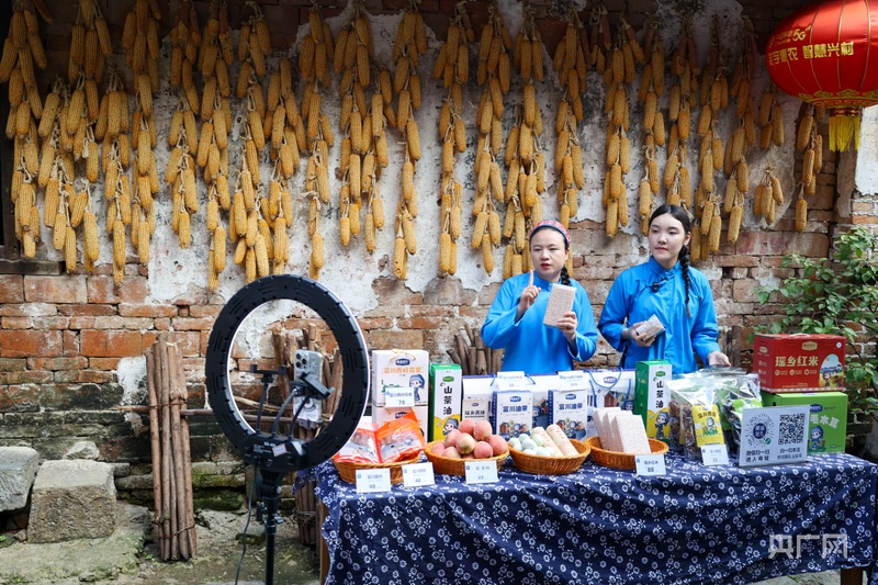 富川羣眾身穿民族服飾進行直播帶貨,推介當地特色農產品(央廣網記者 梁瑜琳 攝)