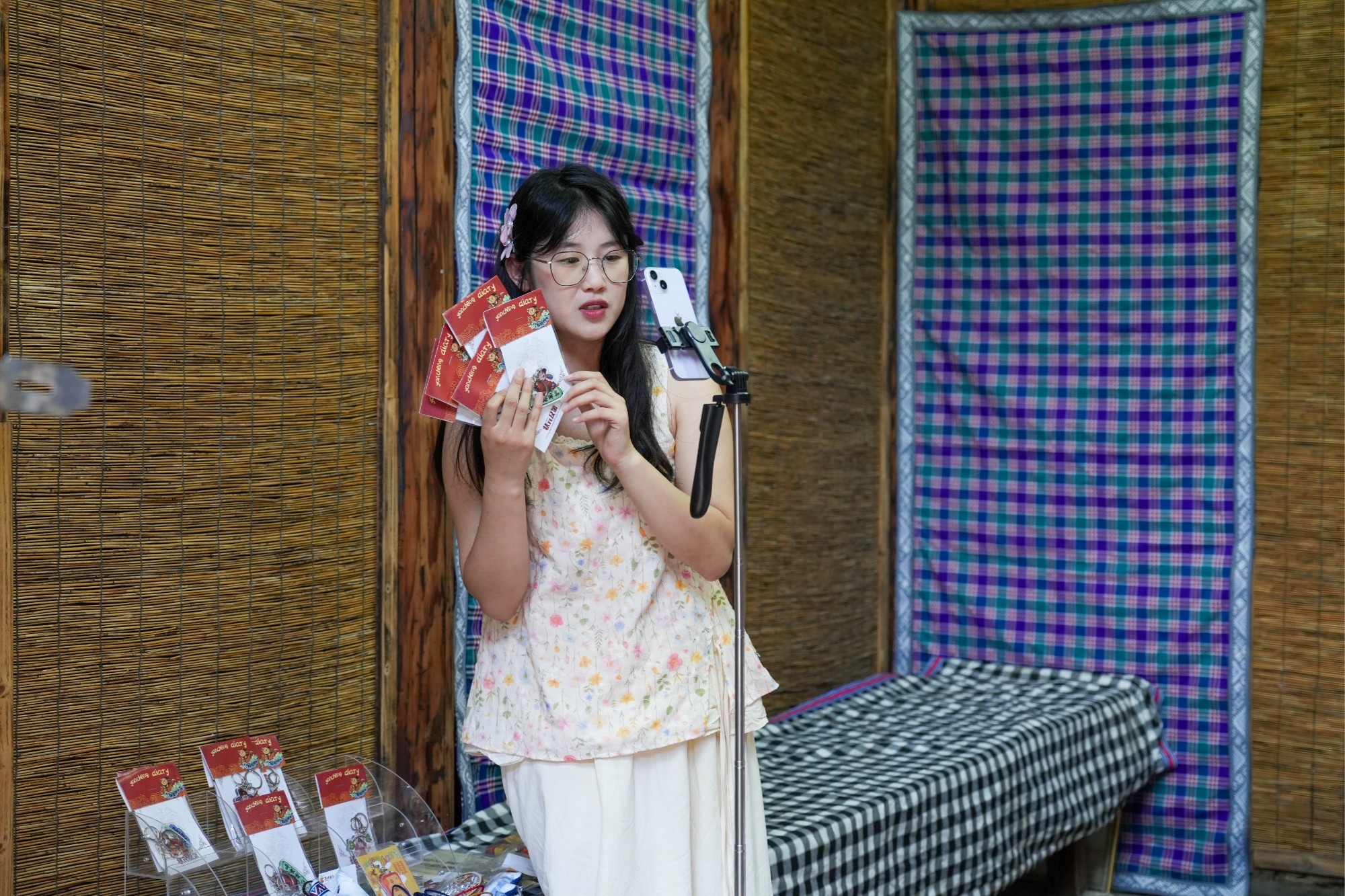 “我們扎染系列的瑤族特色掛件、耳飾等等都是純手工製作的,可以根據大家的需求進行定做。”在直播間裏,何倩詳細介紹每件產品背後的瑤族文化故事、材質、工藝。這種“文創+直播”的模式,不僅讓傳統手工藝煥發新生,也為文創店帶來了穩定的線上客流。