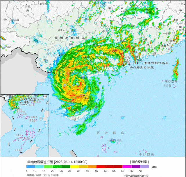 11日以來海南島、廣東、廣西出現強降雨,海南島南部累計雨量達300~500毫米,三亞局地超過600毫米;海南島、廣東雷州半島及沿海、廣西南部等地出現7~9級陣風,局地11~13級。