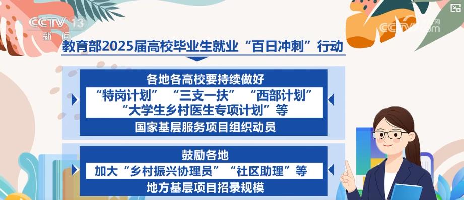 央視網消息:距離2025屆高校畢業生大規模集中離校還有不到一個月左右的時間,教育部近日啓動2025屆高校畢業生就業“百日衝刺”行動,其中明確,要持續做好國家基層服務項目組織動員,鼓勵各地加大地方基層項目招錄規模。那麼到基層就業都有哪些選擇?發展前景如何呢?