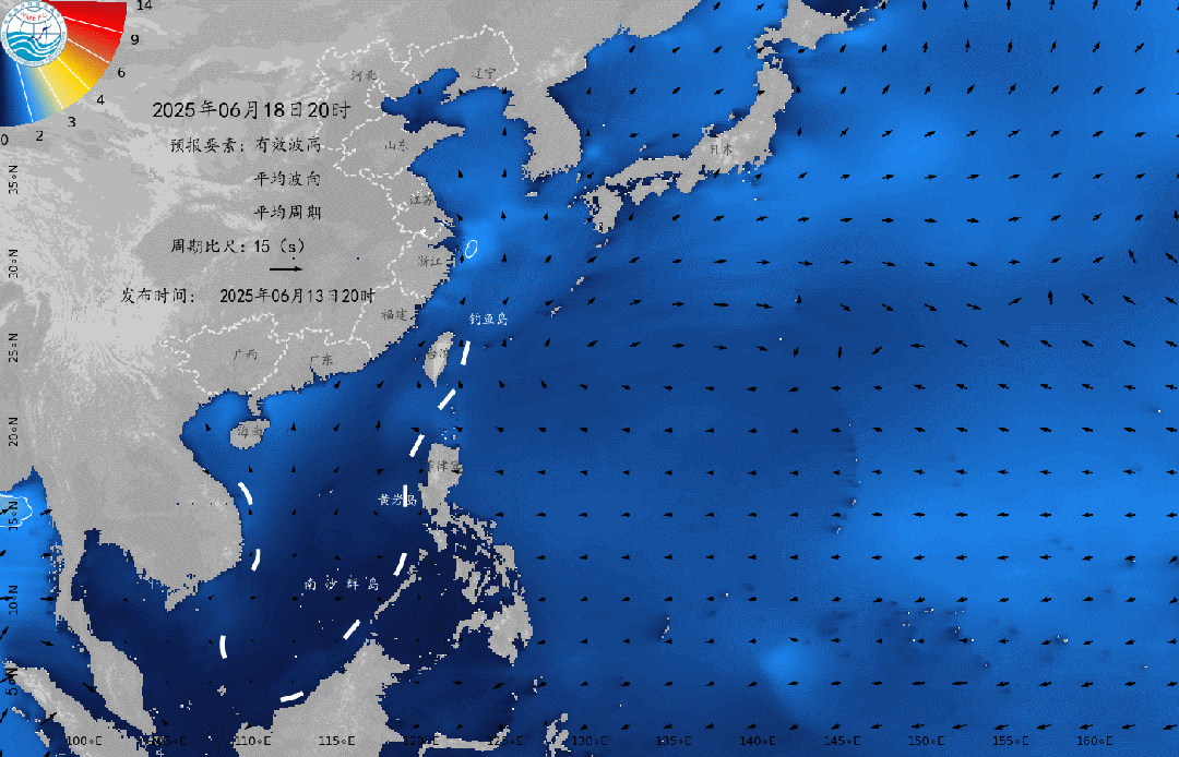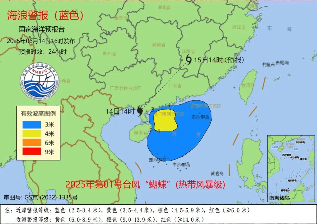 海浪方面,預計6月14日夜間到15日白天*,南海西部將出現3到4.5米的大浪到巨浪區;海南東部、廣東近岸海域將出現2到3.4米的中浪到大浪,近岸海域海浪預警級別為藍色。*