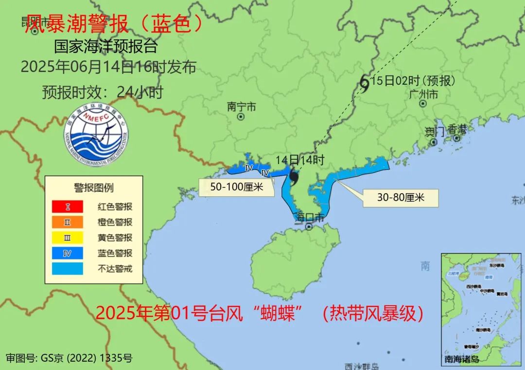 風暴潮方面,預計6月14日下午至15日早晨,廣東陽江到雷州半島沿海將出現30到80釐米的風暴增水,廣西沿海將出現50到100釐米的風暴增水。廣西北海市和欽州市的風暴潮預警級別為藍色。