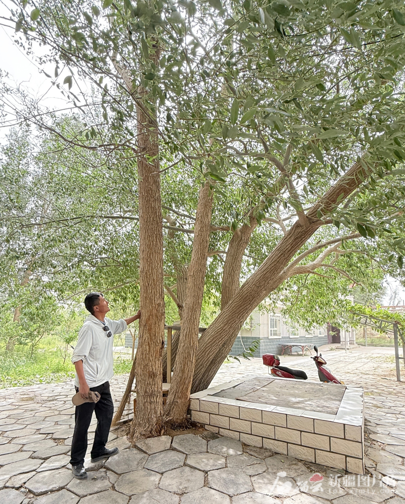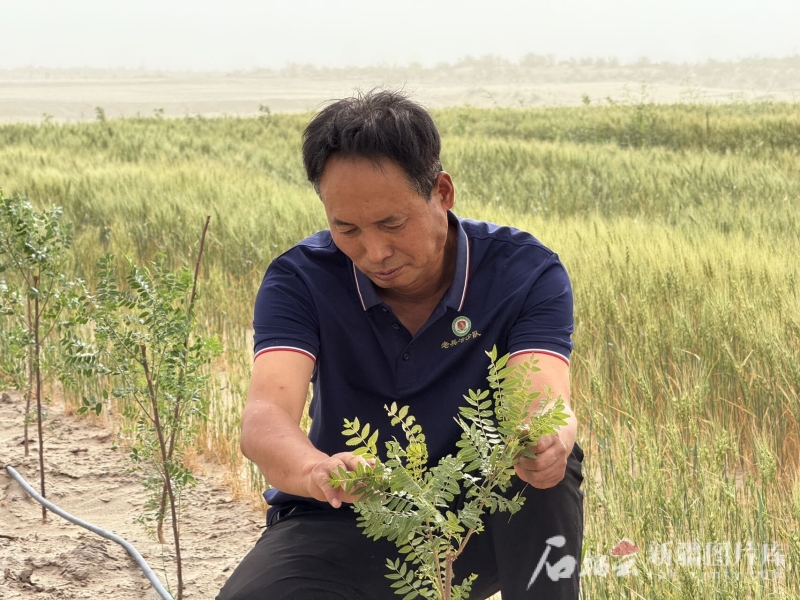 6月13日,且末縣老兵治沙隊創始人田來羣正在查看文冠果苗生長情況。石榴雲/新疆日報記者 拍熱扎提·阿不都攝
