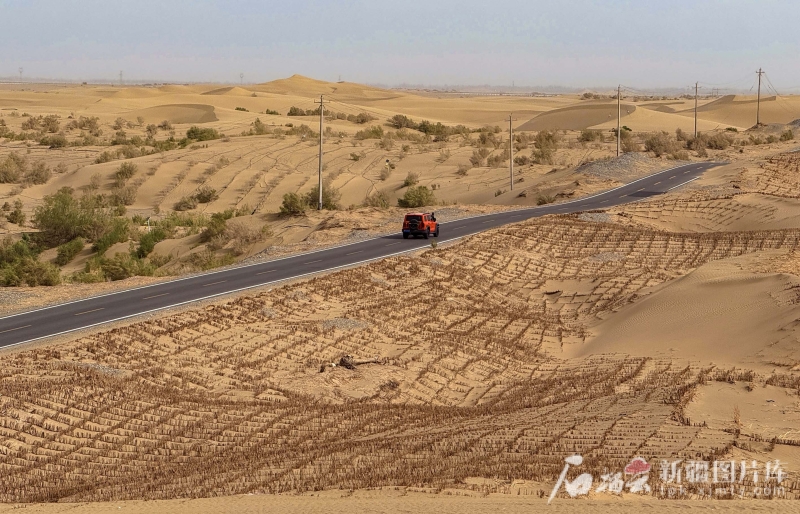 6月13日,且末縣防風治沙基地周圍,一株株紅柳、梭梭及草方格守護着沙海。石榴雲/新疆日報記者 拍熱扎提·阿不都攝