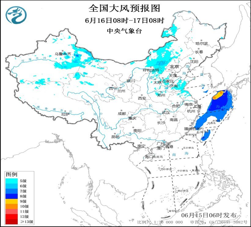 6月16日08時至17日08時,新疆東部、內蒙古中部、山西北部和南部、河北北部、山東大部、河南中北部和東部、江蘇北部等地部分地區有5級、陣風6~8級的大風;東海大部海域、台灣以東洋麪將有7~8級、陣風9級的大風,其中東海東北部海域風力可達9級,陣風10~11級。
