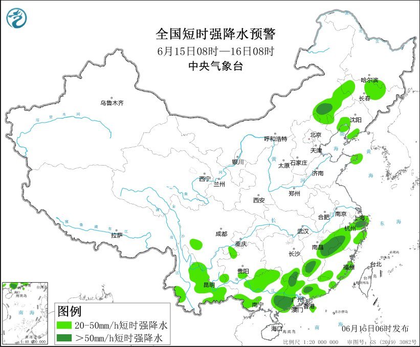 預計,6月15日08時至16日08時,浙江大部、江西大部、上海、福建西北部和南部、安徽東南部、湖南東南部、廣東大部、廣西中部、內蒙古東南部、河北北部、遼寧西部和南部、吉林中部、雲南中部等地的部分地區有大到暴雨,其中,內蒙古東南部、江西中北部、浙江中部等地的局部地區有大暴雨(100~150毫米)。上述部分地區伴有短時強降水(最大小時降雨量20~50毫米,局地可超過70毫米),局地有雷暴大風等強對流天氣。