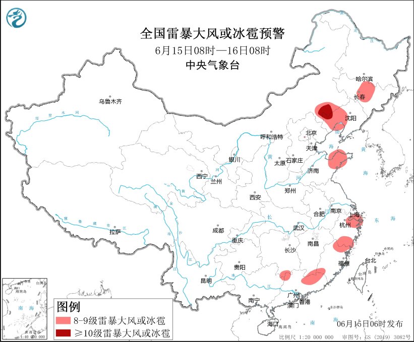 預計6月15日08時至16日08時,內蒙古東南部、東北地區中部和南部、黃淮東部、江南東部、華南東部等地的部分地區將有8級以上雷暴大風或冰雹天氣,其中,內蒙古東南部、遼寧西部等地的部分地區將有10級以上雷暴大風;內蒙古東南部、東北地區中部和南部、黃淮東部、江南中東部、西南地區南部、華南大部等地的部分地區將有小時雨量大於20毫米的短時強降水天氣,其中,內蒙古東南部、湖南南部、江西、浙江中北部、福建西北部、廣西東南部、廣東中西部等地的部分地區小時雨量大於50毫米,最大可達70毫米以上。