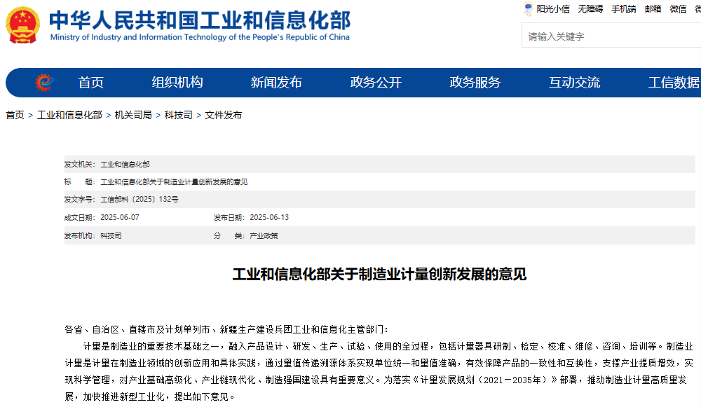 【環球網財經綜合報道】近日,工業和信息化部正式印發《關於製造業計量創新發展的意見》(簡稱《意見》),這是我國製造業計量領域的首個政策性文件,標誌着計量工作在製造業高質量發展中迎來新的里程碑。該文件的發佈是為全面提升製造業計量能力,為構建現代化產業體系築牢技術基石,加速推進製造業產業基礎高級化。