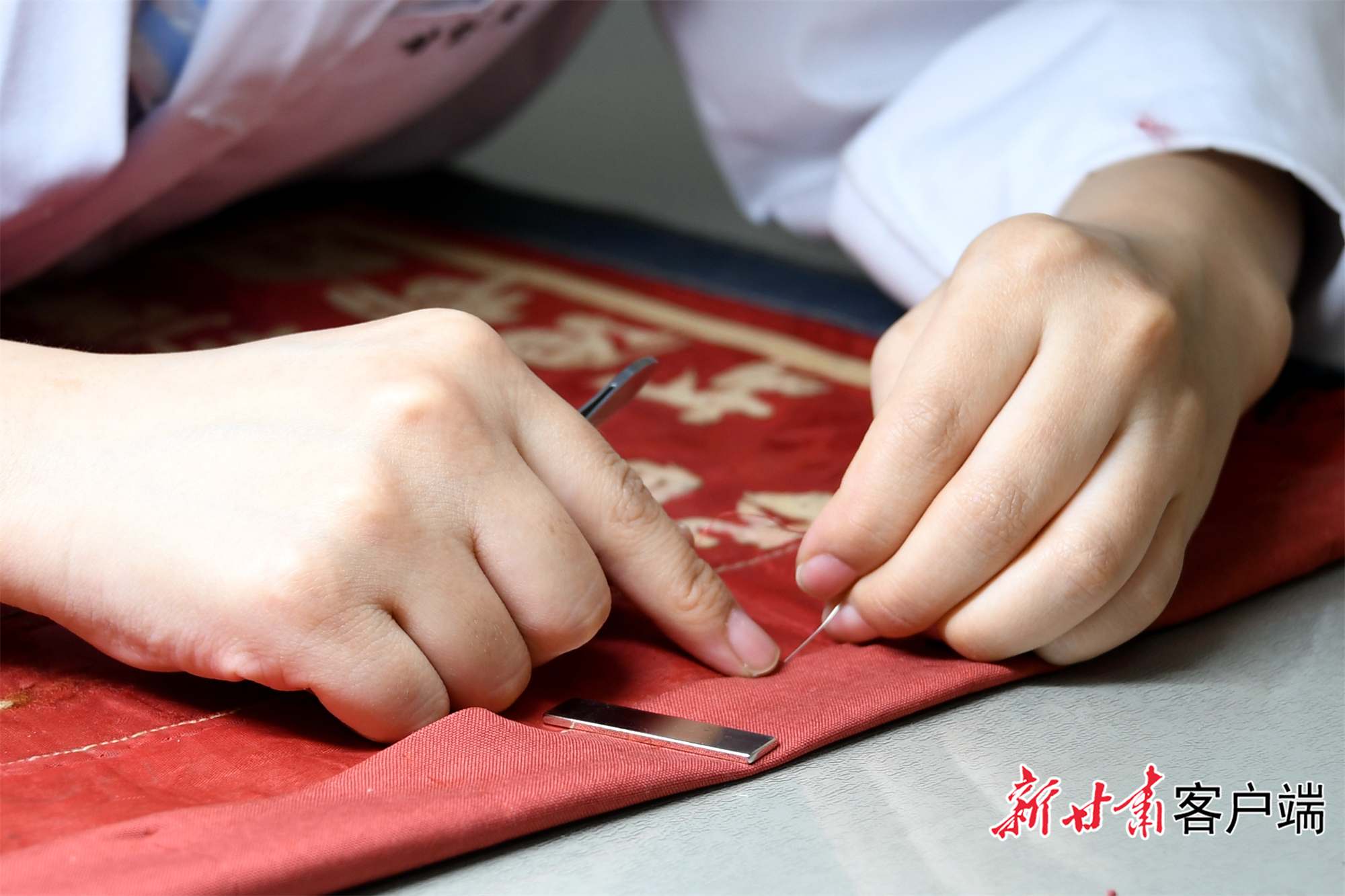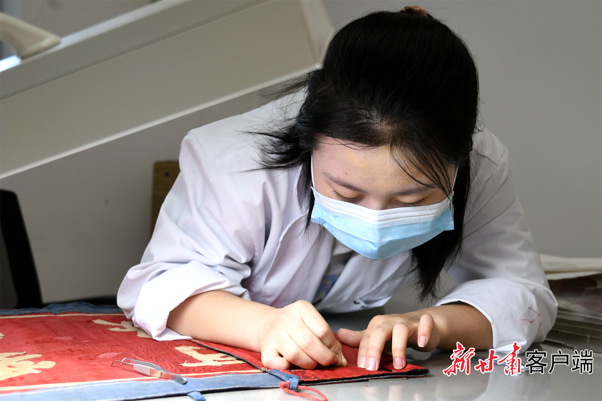 推開甘肅省博物館文物保護中心修復室的門,一股淡淡的陳舊氣息夾雜着特殊的修復材料味道撲面而來。甘肅省博物館文物保護修復中心館員伏妍亭俯身在工作台前修補着一面革命錦旗。