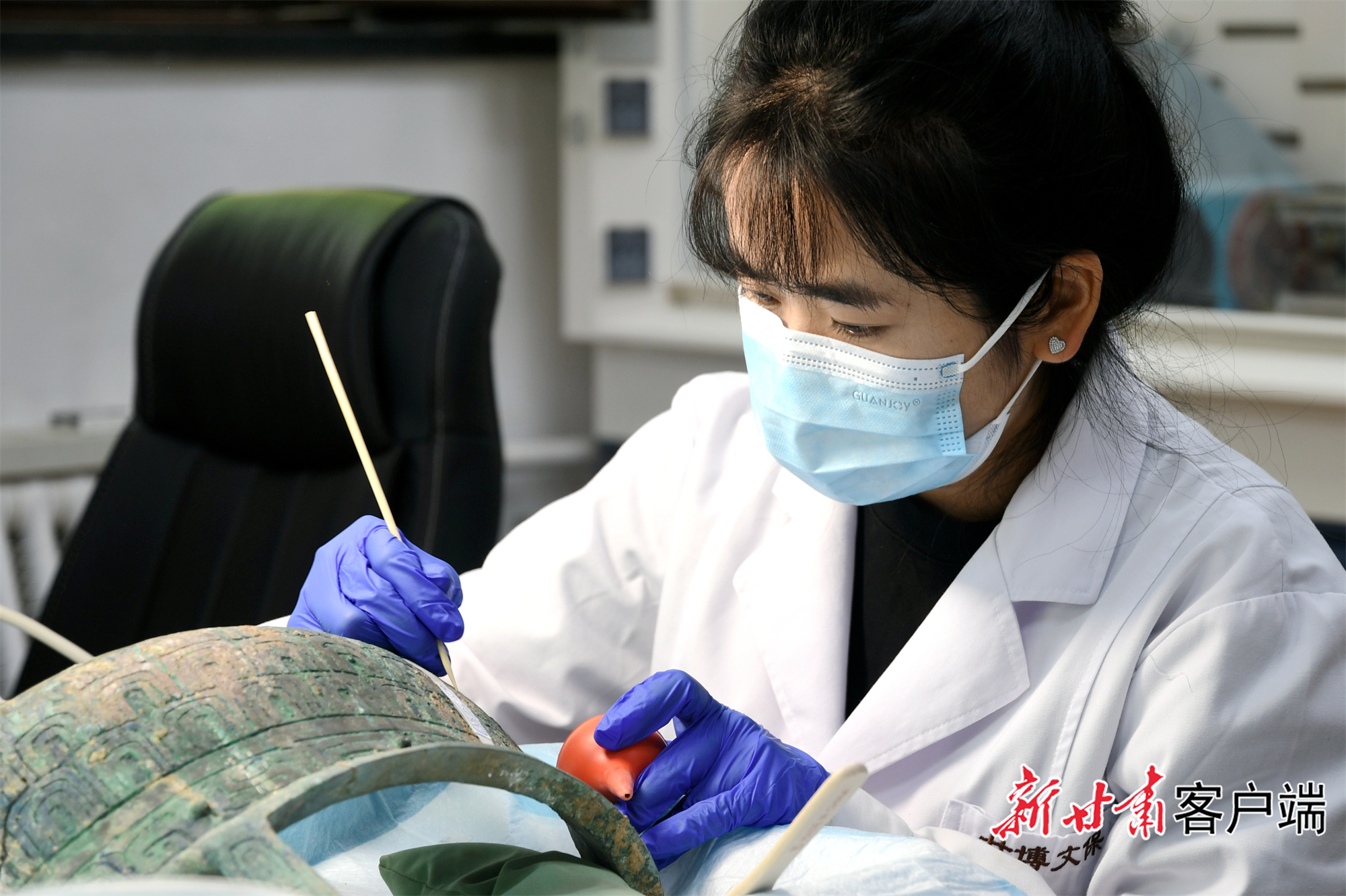 在金屬文物修復室裏,燈光格外明亮。甘肅省博物館文物保護修復中心金屬文物修復師周蕊戴着口罩和手套,正趴在工作台前,盯着一塊西周銅鼎的殘片,眼神里透着一股不服輸的勁兒。
