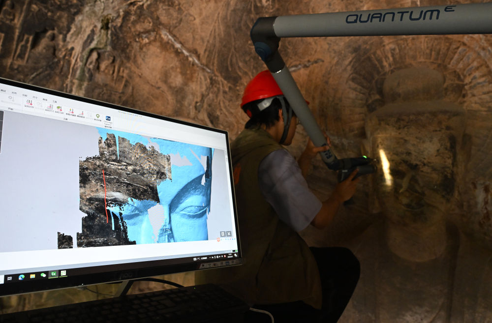 4月9日,武漢大學文化遺產智能計算實驗室團隊成員在龍門石窟魏字洞使用關節臂掃描儀對佛像進行數字化掃描。新華社記者 李嘉南 攝