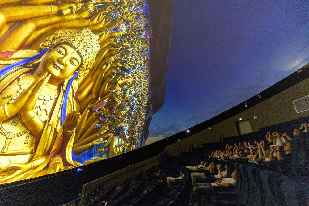 2024年9月27日,遊客在重慶大足石刻景區觀看8K數字球幕影片《大足石刻》。新華社記者 黃偉 攝