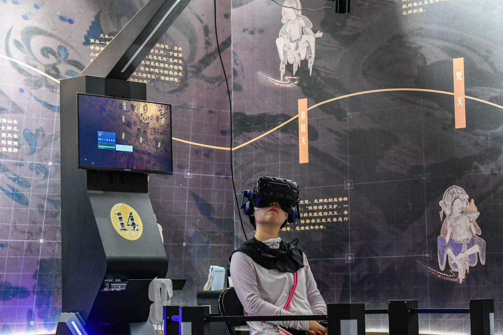 2024年7月22日,遊客藉助VR設備沉浸式遊覽莫高窟第285窟虛擬場景。新華社記者 郎兵兵 攝