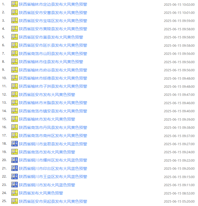 陝西省氣象台2025年06月15日08時52分升級發佈大風黃色預警信號:預計下述地區未來12小時內將受大風影響,平均風力可達8級(17.2m/s),陣風9級(20.8m/s)以上: