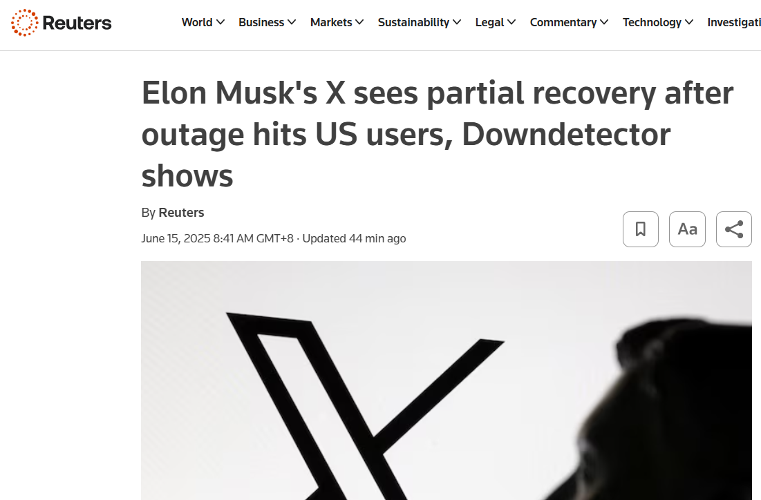 【環球網科技綜合報道】6月15日消息,據外媒報道,近日社交媒體平台X經歷了一次宕機事件,導致美國數千名用户無法訪問。不過,據宕機追蹤網站Downdetector.com報道,該平台目前已顯示出恢復跡象。