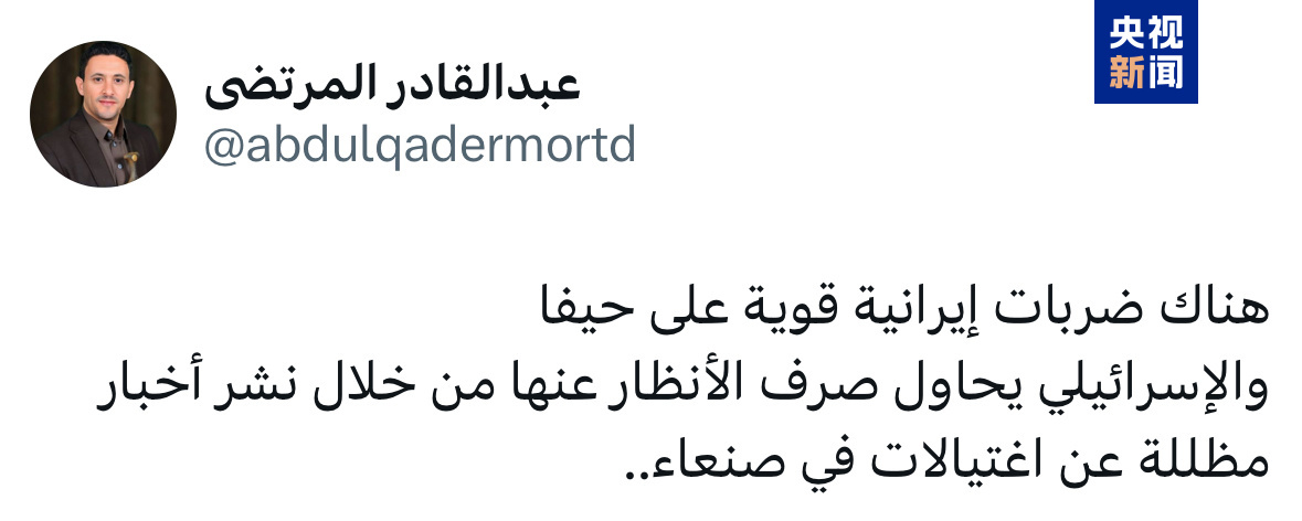 此前,胡塞武裝負責戰俘事務的官員阿卜杜勒-卡迪爾·穆爾塔達在社交媒體平台上表示,伊朗對以色列海法發動了猛烈襲擊,以色列試圖通過傳播有關薩那襲擊事件的誤導性消息來轉移注意力。