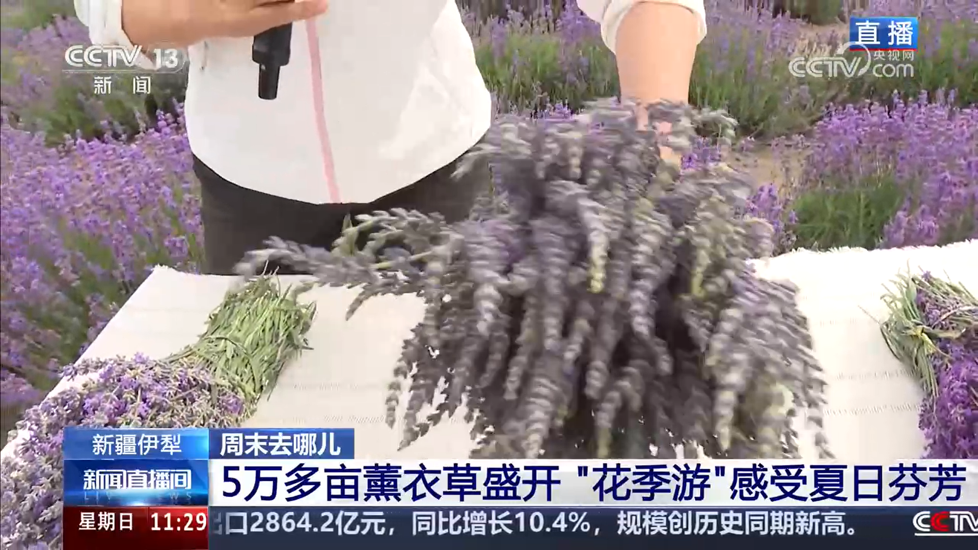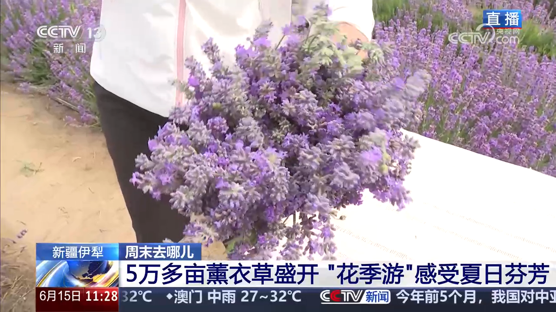 眼下,當地的薰衣草種植已經從一年一季變成一年兩季,花期從二十天左右延長到四個多月,成為世界三大薰衣草主產區之一。經過種植、加工、文旅三產融合,薰衣草已經實現了“身價”翻倍,我們現在看到的這些鮮花,每1000克鮮花就可以提煉出10毫升的精油,當地薰衣草產業總產值累計達到35億元,有效帶動當地居民增收。