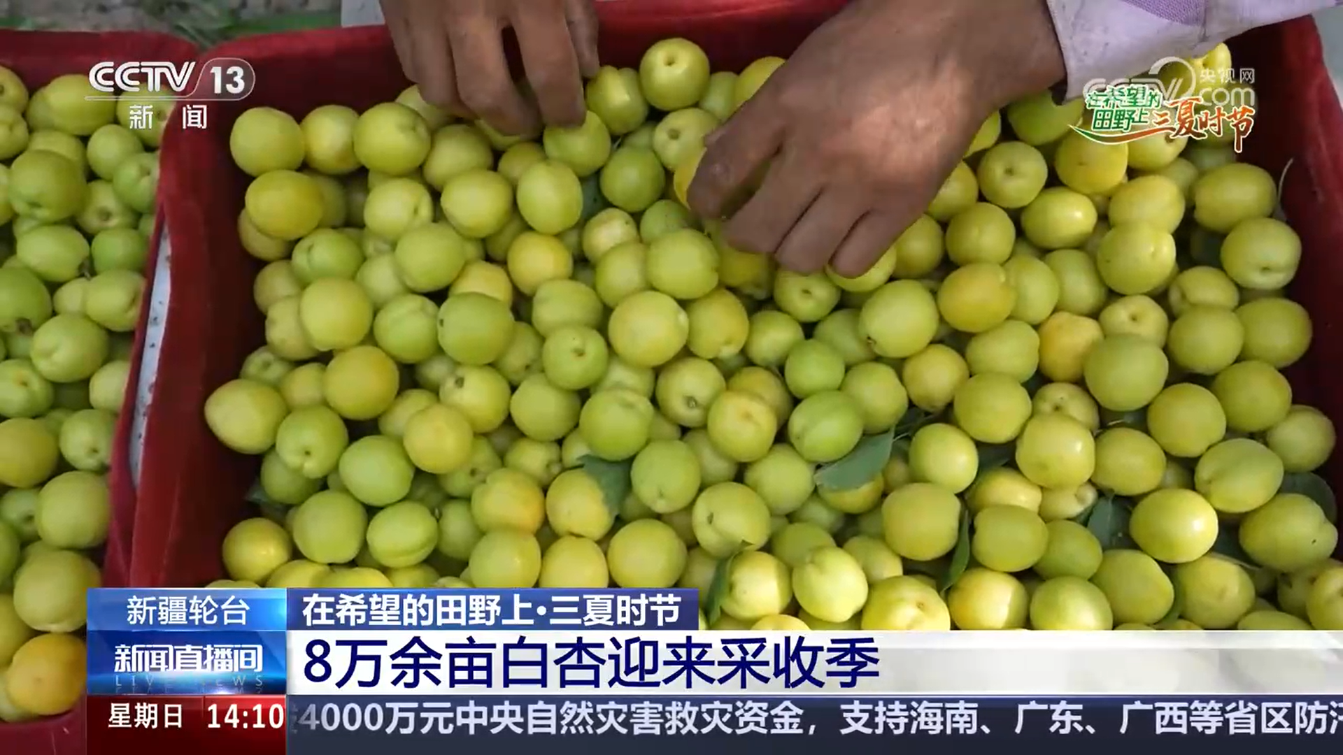 在新疆巴州輪台縣陽霞鎮,成片的杏樹枝繁葉茂,一顆顆成熟飽滿的白杏掛滿枝頭,果農們穿梭在杏園裏,熟練地將白杏採摘入筐,等待打包運輸。