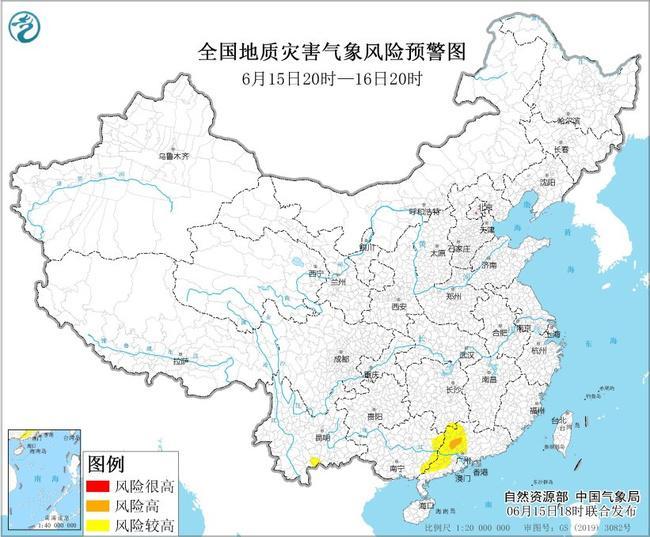 預計,6月15日20時至16日20時,湖南南部、廣東中西部、廣西東部、雲南南部等地部分地區發生地質災害的氣象風險較高(黃色預警),其中,廣東中西部等地部分地區發生地質災害的氣象風險高(橙色預警)。