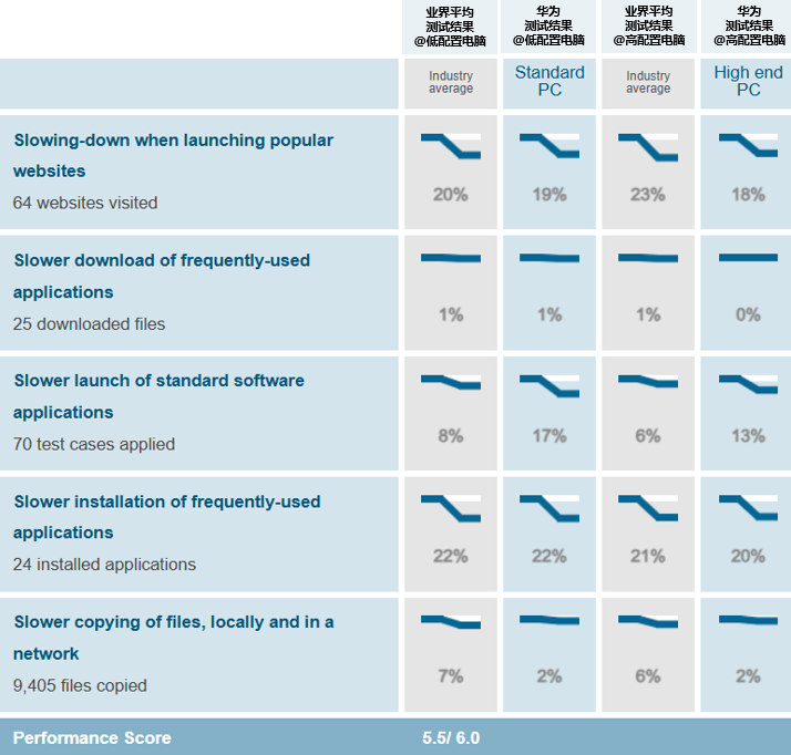 HiSec Endpoint在性能維度獲得5.5分(滿分6.0分)的評分。性能測試數據顯示,HiSec Endpoint對日常操作的影響控制在極低水平:訪問64個常用網站的速度延遲低於業界平均水平5%,25個應用程序的下載耗時接近0影響,拷貝9405個文件的速度影響率低於業界平均水平5%。HiSec Endpoint的CPU佔用率穩定在1%以下,內存佔用低於200MB,可在終端辦公場景實現輕量無感防護。