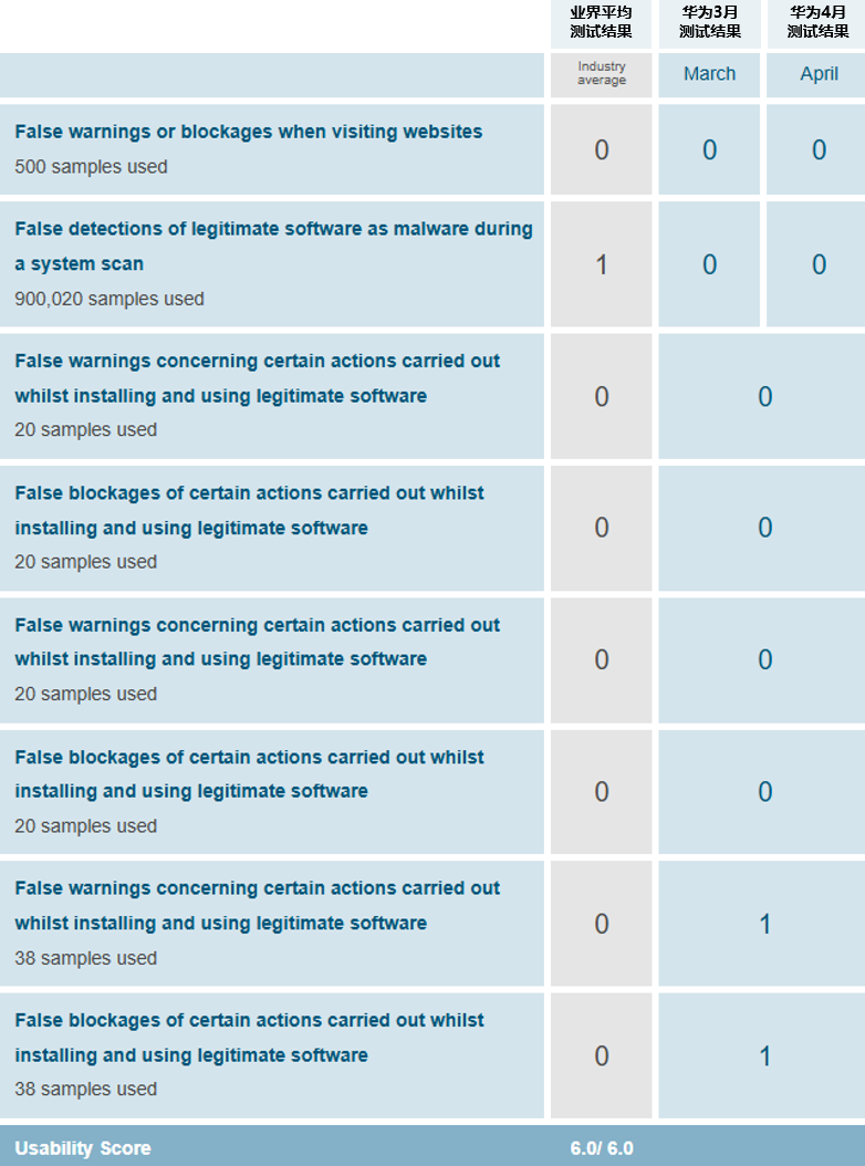HiSec Endpoint在易用性維度獲得6.0的滿分評分。易用性測試表明,HiSec Endpoint在500個網站訪問測試中實現零誤報攔截,90萬個合法程序掃描0誤判。在20款企業級軟件的安裝使用過程中,未出現因安全策略導致的安裝阻止。體現出產品具備極低誤報率和高易用性。