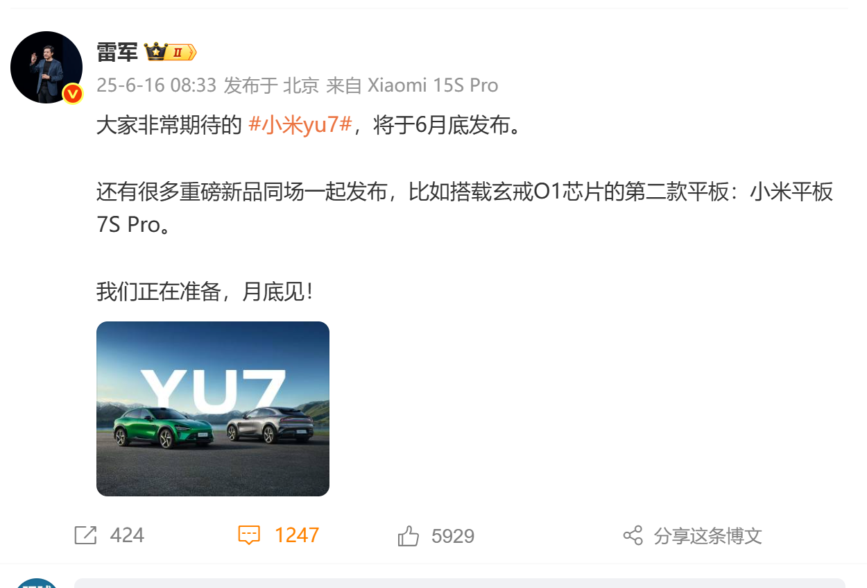 【環球網科技綜合報道】6月16日消息,小米創始人雷軍在其社交賬號上正式宣佈,備受關注的小米YU7將於6月底發佈。這款新車中文名為“小米御7”,“御”字寓意“陸地戰車,御風而行”,其名稱靈感源自《莊子·逍遙遊》。