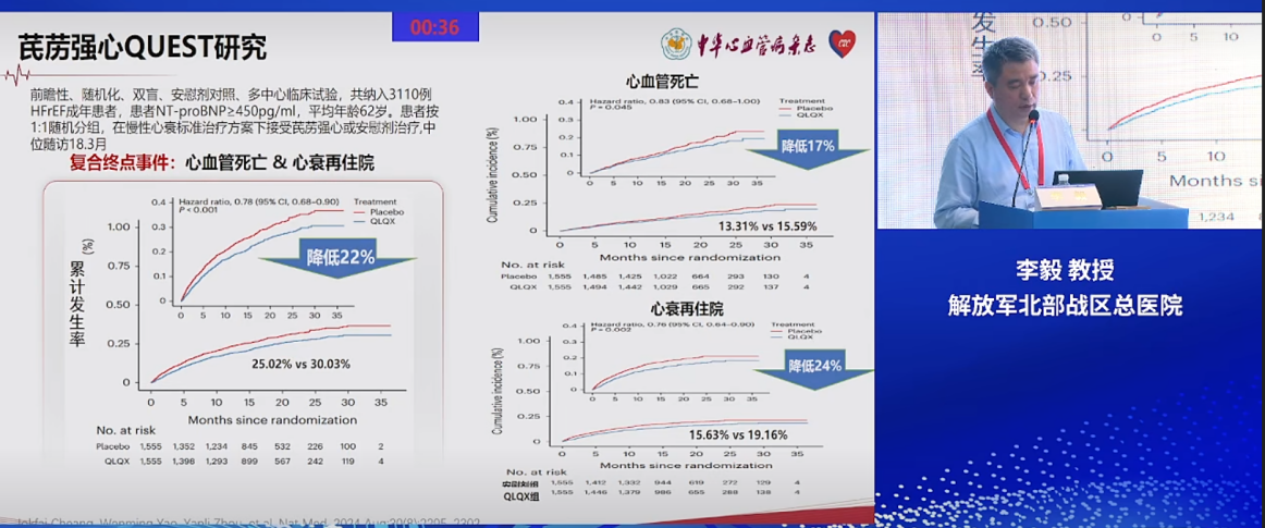 心衰是急性心肌梗死的常見併發症,一些對心衰有益的常規西藥往往存在降低血壓的作用,所以對於血壓偏低的患者並不適用。芪藶強心是在絡病理論指導下研發的創新中藥,已被證明可以顯著改善慢性心衰患者的心臟和運動功能,同時可顯著改善心衰患者臨牀預後,且對血壓沒有影響。2024年,國際頂級醫學期刊《自然醫學》發表了由南京醫科大學第一附屬醫院李新立教授牽頭完成的“芪藶強心膠囊治療慢性心衰複合終點事件的評估研究”。結果顯示,在心衰標準治療基礎上加用芪藶強心,能顯著降低心衰患者的複合心血管事件發生風險22%,包括降低心衰惡化再住院風險24%和心血管死亡風險17%,為優化臨牀合理用藥方案提供了高質量臨牀證據,且安全性表現良好。