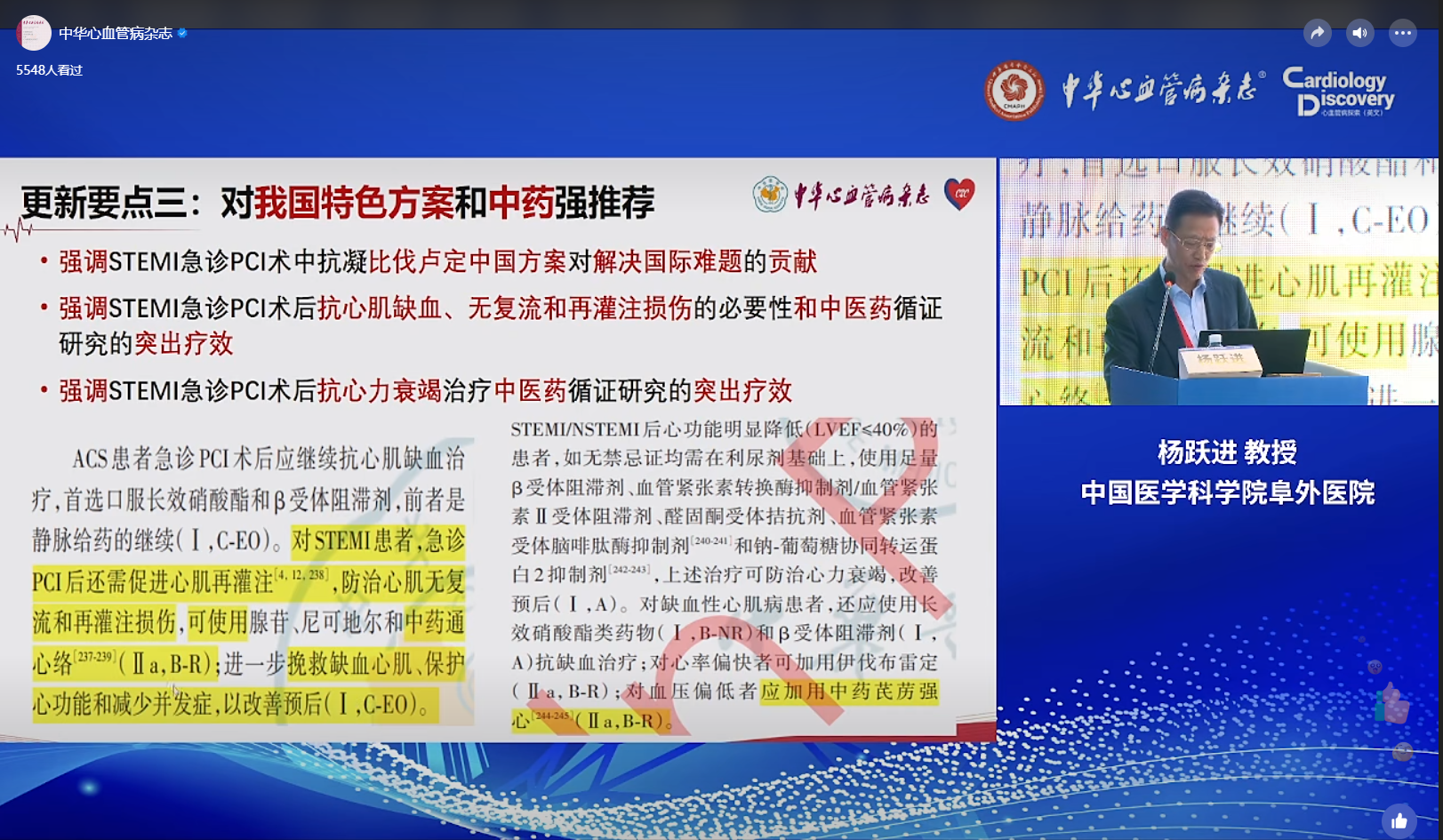 解放軍北部戰區總醫院李毅教授在會議上強調,指南在關注冠狀動脈大血管再通的同時,關注微循環改善,更關注全面管理,新增抗心肌缺血、無複流和再灌注損傷章節。同時,注重中西醫結合, 根據中醫藥臨牀循證研究結果,新增更具有中國特色的治療方案: 抗心肌缺血、無複流和再灌注損傷,推薦通心絡; 心衰防治,推薦芪藶強心。