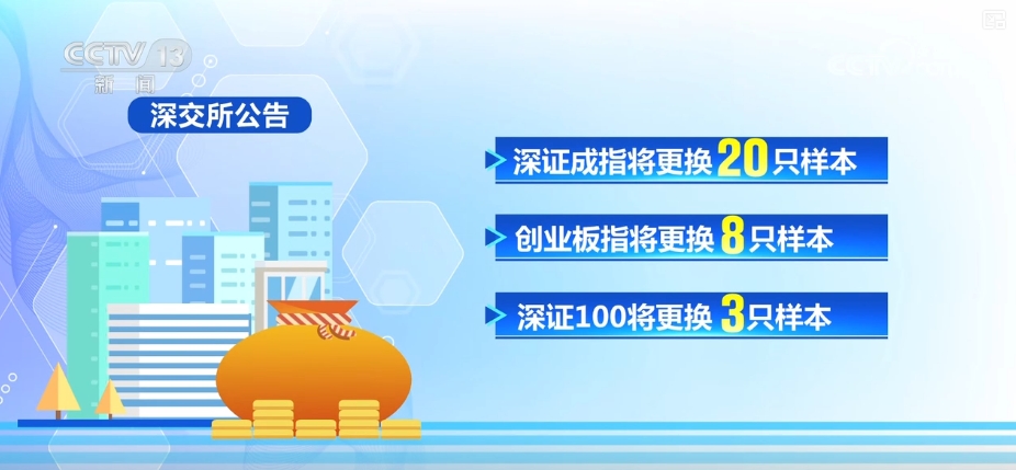 深交所公告,深證成指將更換20只樣本、創業板指將更換8只樣本、深證100將更換3只樣本。中證指數有限公司公告顯示,滬深300指數更換7只樣本、中證500指數更換50只樣本、中證A50指數更換4只樣本、中證A100指數更換5只樣本、中證A500指數更換21只樣本。