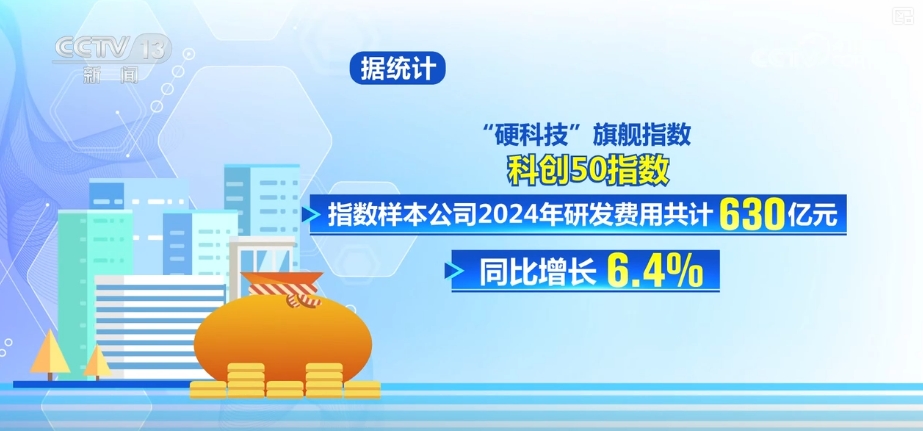據統計,以“硬科技”旗艦指數——科創50指數為例,指數樣本公司2024年研發費用共計630億元,同比增長6.4%。六成以上樣本公司研發強度超10%,20家樣本公司研發投入超過10億元,主要集中在新一代信息技術、生物醫藥、高端裝備等產業。