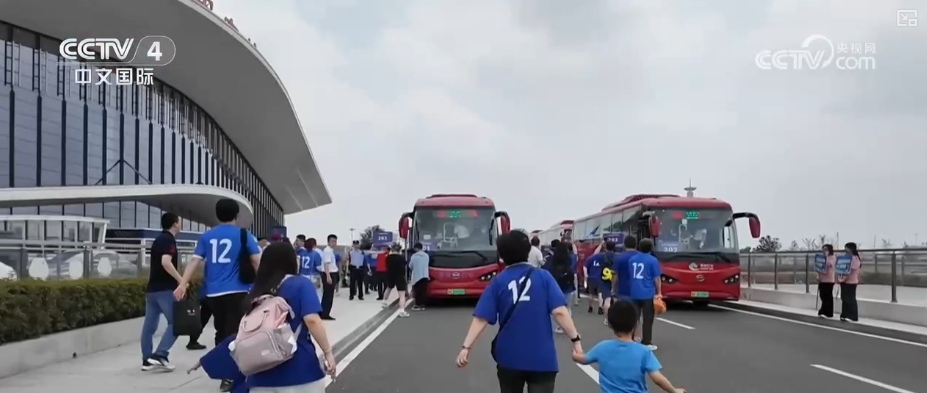 中午12時30分,列車準時到站,25輛接駁大巴已在站外就位。在現場工作人員的引導下,球迷們有序換乘,奔向球場。