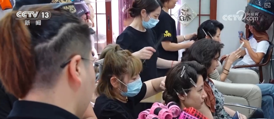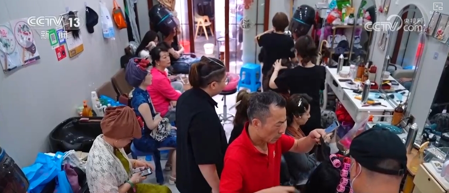 曾林旺和丈夫徐可玉共同經營着阿旺美髮店,店裏的顧客很多都是慕名而來。生意爆火後,來自全國各地的客人蜂擁而至,家裏的妹妹和弟媳也來幫忙。從早到晚,一整天下來,師傅們的手幾乎一刻不停。