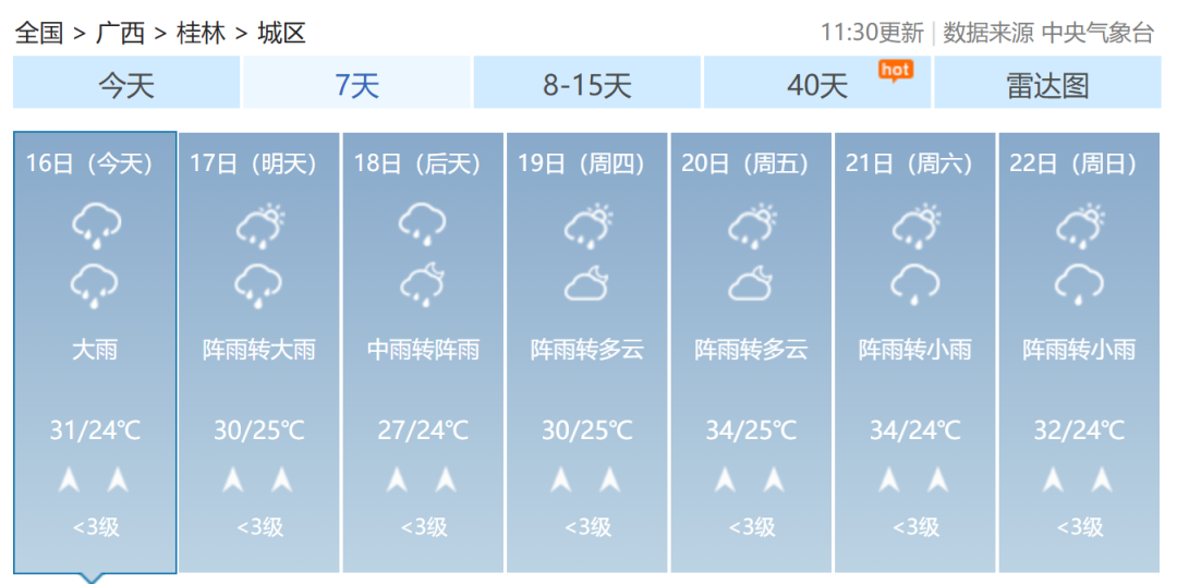 今天白天,桂林北部有陣雨,中南部中雨、局部大雨,並伴有短時雷暴大風等強對流天氣。偏南風1-2級。今天晚上,全市陰天有陣雨或雷雨、局部大雨。偏南風1-2級。