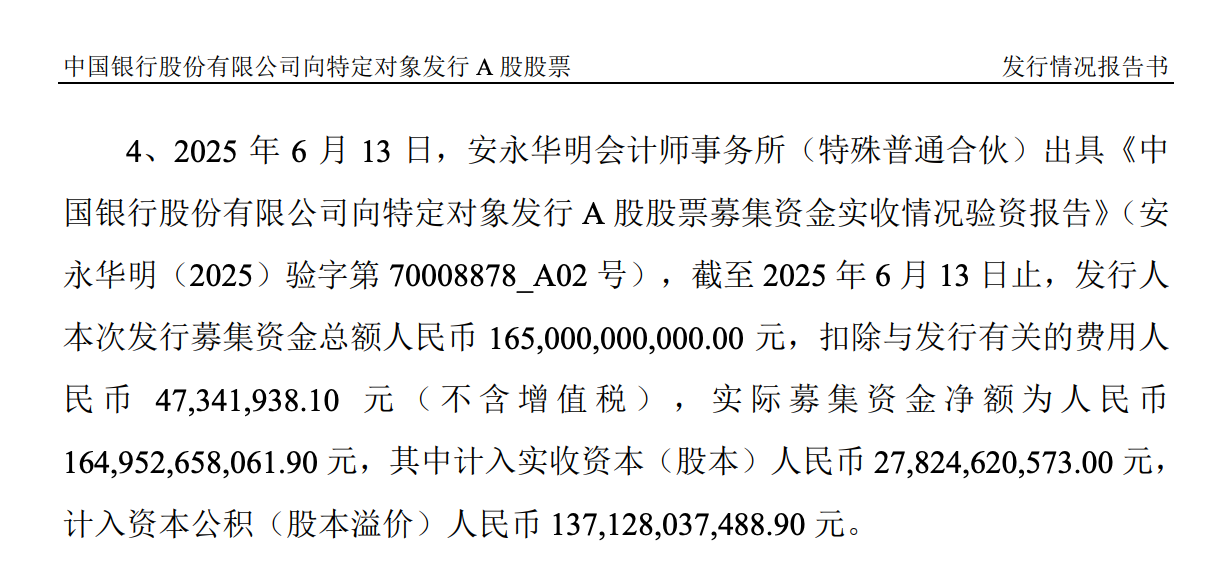 具體來看,中國銀行公告稱,收到投資者繳付的認購資金共計1650億元,其中財政部以現金方式全額認購,發行價格為5.93元/股,認購股數達278.25億股。扣除發行費用後,中國銀行實際募集資金淨額為1649.53億元,其中278.25億元計入實收資本(股本),1371.28億元計入資本公積(股本溢價)。