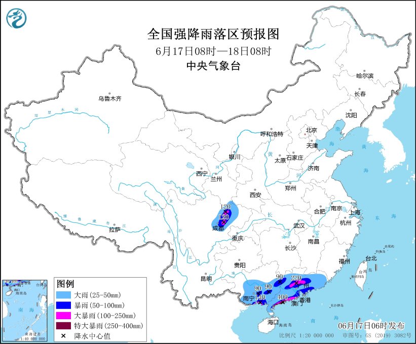 預計6月17日08時至18日08時,廣東大部、廣西中南部、四川盆地西北部等地部分地區有大到暴雨,其中,廣東中部和西南部沿海、廣西東南部沿海、四川盆地西北部等地部分地區有大暴雨,廣東西南部沿海局地特大暴雨(250~400毫米)。上述部分地區伴有短時強降水(最大小時降雨量20~50毫米,局地可超過70毫米),局地有雷暴大風等強對流天氣。中央氣象台6月17日06時繼續發佈暴雨藍色預警。
