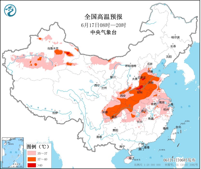 預計6月17日白天,華北南部、黃淮、江淮西部、江漢、江南北部、西北地區東南部、西南地區東部以及內蒙古西部、新疆吐魯番盆地和南疆盆地等地有35~39℃高温天氣,其中,河北南部、河南中北部、新疆吐魯番盆地等地局地可達40℃以上(見圖2)。*中央氣象台6月17日06時繼續發佈高温黃色預警。*18日起,高温的範圍和強度將明顯減弱。