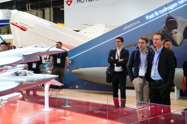 【環球時報-環球網報道 記者 樊巍】當地時間6月16日,被譽為“全球航空航天界奧林匹克”的第55屆巴黎-布爾歇國際航空航天展覽會(以下簡稱“巴黎航展”)在法國巴黎正式拉開帷幕。本屆巴黎航展上,在近期創下輝煌空戰戰績的殲-10CE戰機成為了媒體關注的“頂流”。據《環球時報》記者瞭解,許多遊客也慕名來到中國航空工業集團展台“打卡”,與展出的殲-10CE戰機模型合影留念。對於殲-10CE戰機在巴黎航展上掀起的“中國風”,中國航空工業集團巴黎航展代表團副團長朱謙6月16日向《環球時報》等媒體記者表示,殲-10CE等戰機的參展是中國航空工業以開放、共贏之心參與全球航空產業鏈建設的例證。