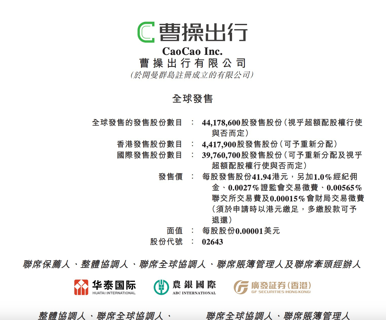公告顯示,曹操出行計劃全球發售4417.86萬股股份,其中香港發售股份為441.79萬股,國際發售股份為3976.07萬股,每股發售價為41.94港元。預計募資18.53億港元。