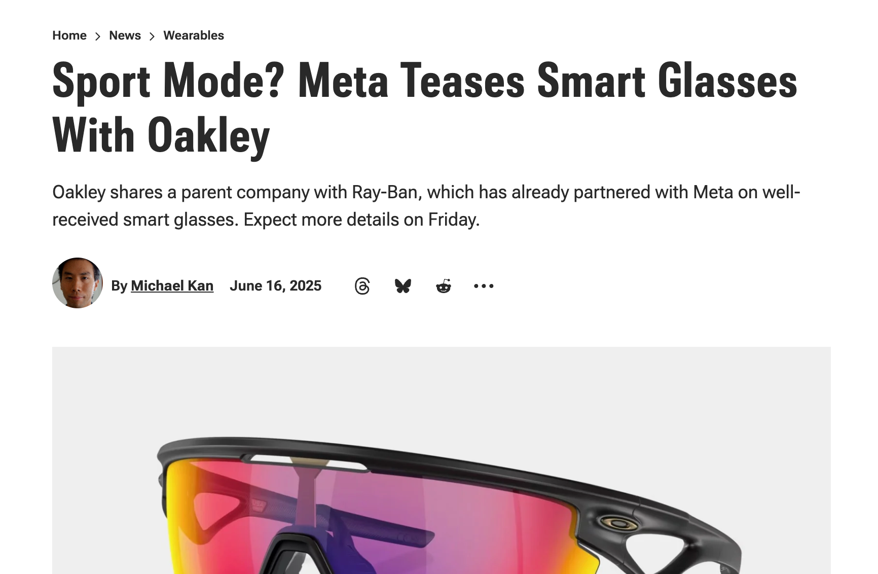 據《The Verge》《TechCrunch》等外媒報道,此次合作被視為Meta在可穿戴設備領域的又一重要佈局。Oakley作為全球運動眼鏡市場的領導者,其專業光學技術與時尚設計或為Meta智能眼鏡注入差異化競爭力。預告視頻中雖未透露具體功能細節,但外媒推測,該產品可能集成AR顯示、即時運動數據追蹤及語音交互功能,瞄準户外運動、健身愛好者等細分市場。