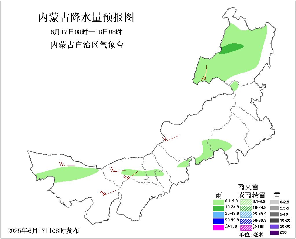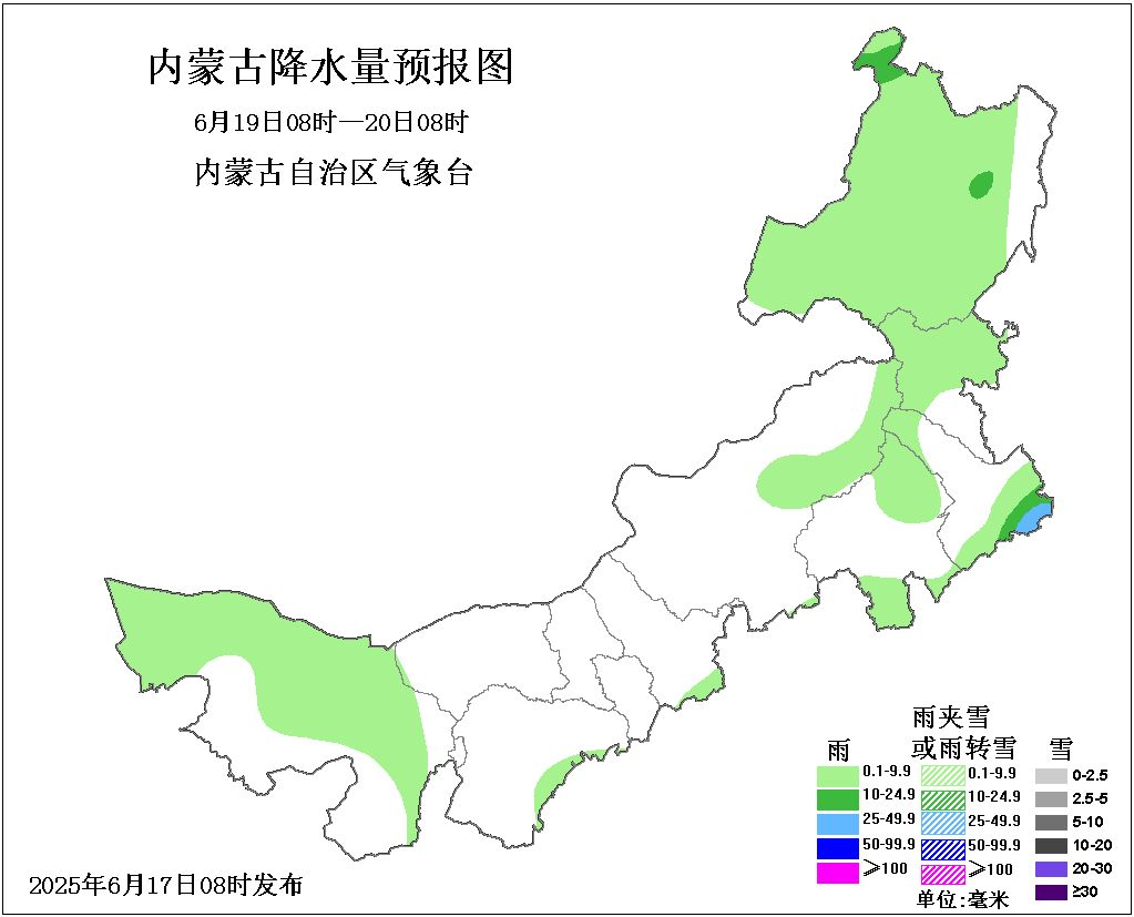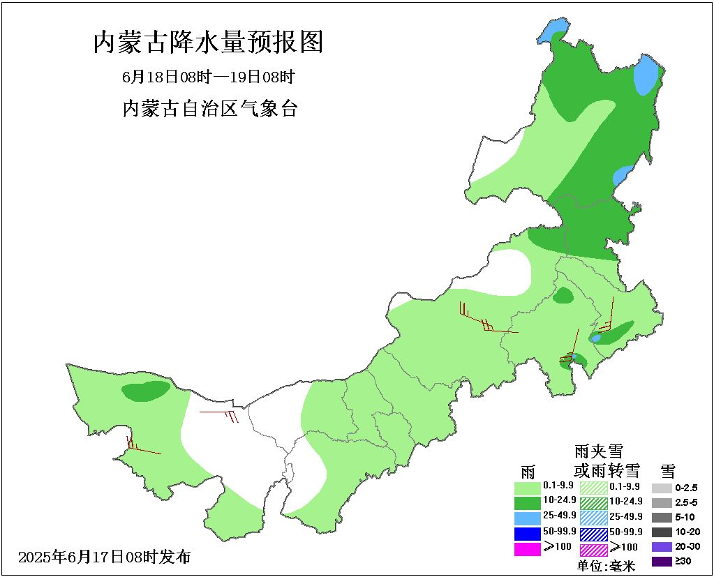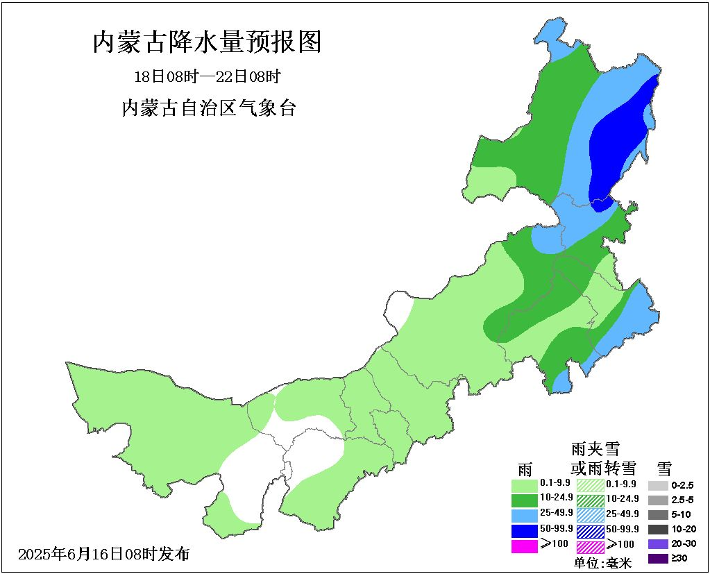 預計,6月18日至21日,全區大部地區有分佈不均勻的小雨,其中,錫林郭勒盟東北部、赤峯市北部和東南部、通遼市西北部和南部、興安盟大部、呼倫貝爾市大部有中到大雨、興安盟東北部、呼倫貝爾市東部有暴雨,上述地區可能伴有短時強降水、雷暴大風、冰雹等強對流天氣。
