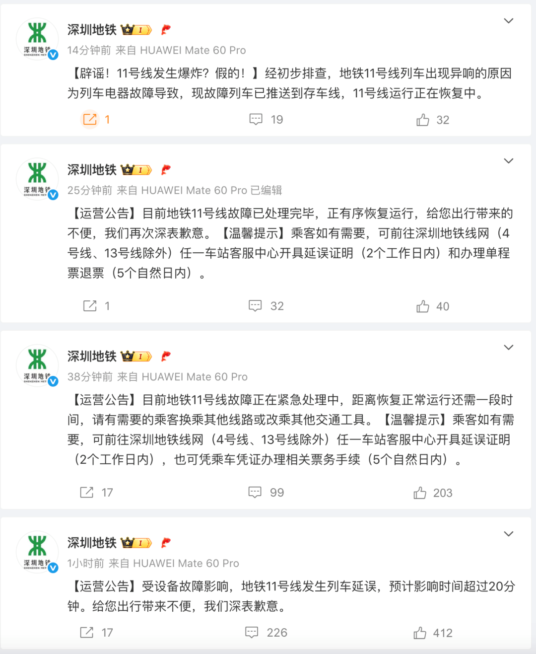 “深圳11號線出現爆炸聲冒煙”“11號線,車緩行到碧海灣,到站就説要讓我們下車,然後聽到爆炸聲”……