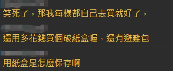 還有網友説,“那我每樣都自己去買就好了,還用多花錢買個破紙盒,避難包用紙盒怎麼保存啊”。