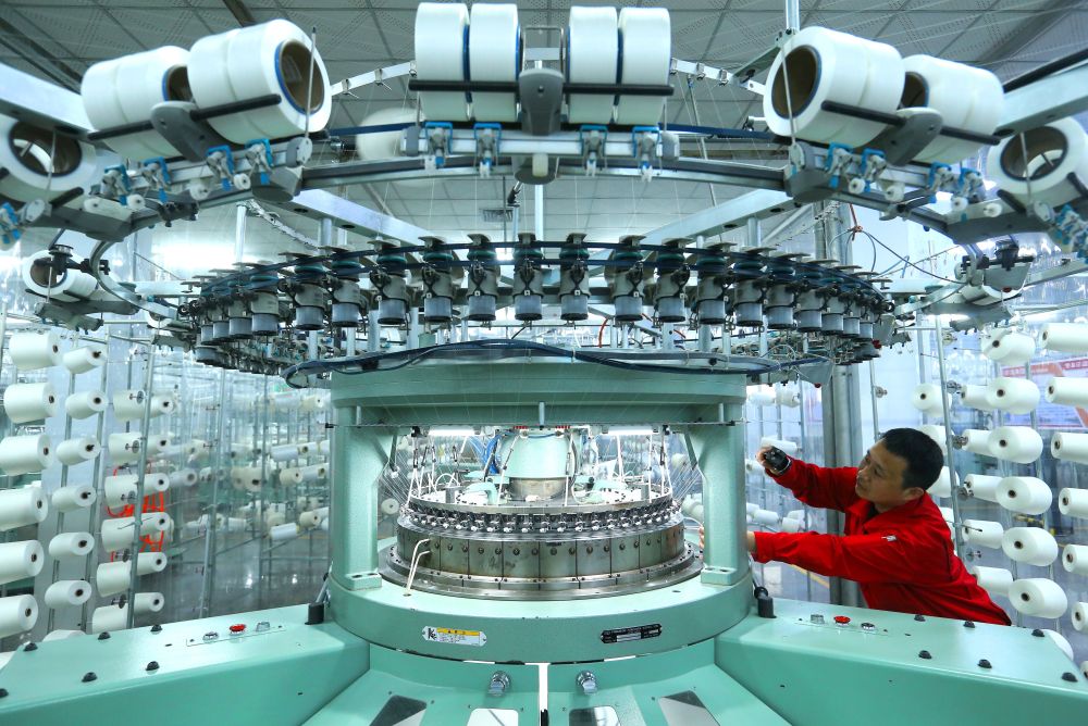 5月19日,山東省青島市即墨區龍山街道一家紡織企業的工人在生產出口海外市場的服裝面料。新華社發(梁孝鵬 攝)