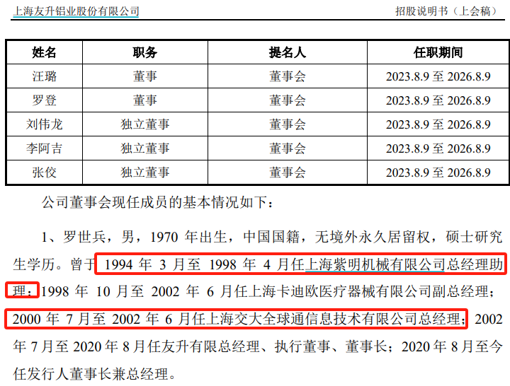 根據招股書披露,友升股份的董事長為羅世兵,此前於2000年7月至2002年6月任上海交大全球通信息技術有限公司總經理。但是根據《天眼查》信息查詢顯示,上海交大全球通信息技術有限公司註冊成立於2000年12月,相比羅世兵任職時間晚了半年。