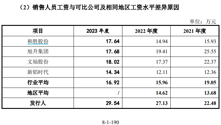 此外,根據《審核問詢函的回覆》第190頁披露,公司銷售人員工資與可比公司及相同地區工資水平存在顯著差異。對此公司分析稱:報告期內,公司銷售人員平均薪酬與文燦股份、旭升集團較為接近,高於和勝股份、新鋁時代,處於同行業可比公司銷售人員平均薪酬範圍內。但從數據來看,公司的銷售人員2023年平均薪酬為29.54萬元,而被公司認為“較為接近”的文燦股份、旭升集團分別為18.02萬元和17.68萬元,公司的銷售人員薪酬水平較後者高出了50%以上。