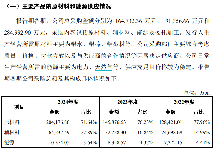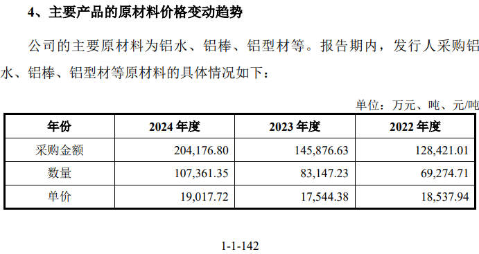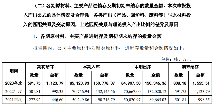 還有招股書第142頁披露,公司在2022年和2023年採購的鋁類原材料數量分別為6.93萬噸和8.31萬噸,但與此同時,《審核問詢函的回覆》第143頁披露的“各期原材料、主要產品進銷存及期初期末結存的數量金額”顯示,2022年鋁類原材料入庫數量為7.08萬噸、2023年為8.51萬噸,都比招股書披露的採購數量多出了1500至2000噸,至於這部分差異數量從何而來,友升股份並未接受記者採訪。
