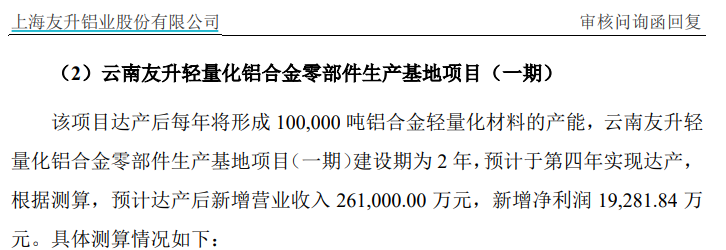 再來看友升股份的募投項目,“雲南友升輕量化鋁合金零部件生產基地項目(一期)”是友升股份本次IPO的募投項目之一,根據《審核問詢函的回覆》披露,該項目達產後將形成100000噸鋁合金輕量化材料的產能,新增營業收入261000.00萬元。由此計算,募投項目對應產品預計銷售單價僅為2.61萬元/噸,不僅明顯低於2024年公司產品4.48萬元/噸的銷售單價,甚至低於2024年產品的單位生產成本。