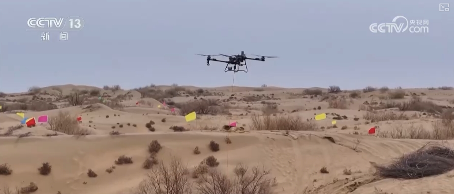 在內蒙古鄂托克旗,無人機精準吊運沙柳枝條飛赴指定區域投放。地面上,無人植樹機器人與半自動種植車高效協作,成為新一代“治沙利器”。